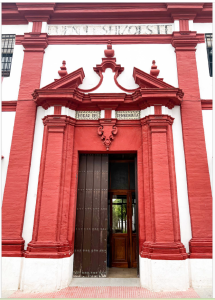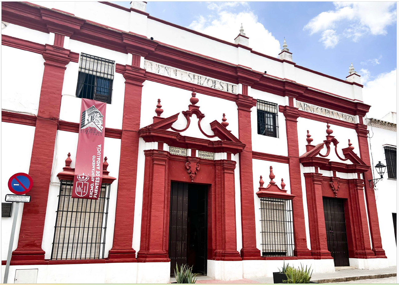 Desde 1597 existía un edificio destinado a pósito, carnicería y pescadería en la villa de Fuentes. En 1736 esa construcción se amplió a costa del terreno de una casa lindante. Para esas fechas se distribuían en una planta baja donde tenían sitio matadero y carnicería, y unos graneros situados en el piso alto. Constatada la ruina de la edificación en esa fecha, y dado que era lugar céntrico en la villa, se decidió segregar el matadero de las demás funciones, destinándose a un edificio específico situado al término de la calle Mayor y que construiría Juan Ruiz Florindo. Algunos años después, en 1746, el maestro de obras Jerónimo Moreno dirigiría las obras de restauración del pósito y carnicería. Para 1790 el edificio estaba nuevamente en riesgo de ruina por una quiebra de una de sus cubiertas, por lo que se encargó al maestro Alonso Ruiz Florindo de Carmona una intervención general sobre el mismo. Tras la ejecución de las obras en 1791 quedó un edificio de dos alturas con una potente crujía de calle, cubierta por bóvedas con aristas y otra nave perpendicular, de menor altura, recorrida por una líneas de arcos sobre la que monta la hilera del tejado a dos aguas. En fachada, en un orden gigante de pilastras toscanas se insertan dos portadas gemelas, quizá cada una para el acceso a la doble función del edificio. Muestran la tradicional reiteración de planos de pilastras, marcada la clave de cada vano arquitrabado de acceso con un pinjante, y frontones rotos y cursos rematados por los pináculos característicos del estilo familiar.